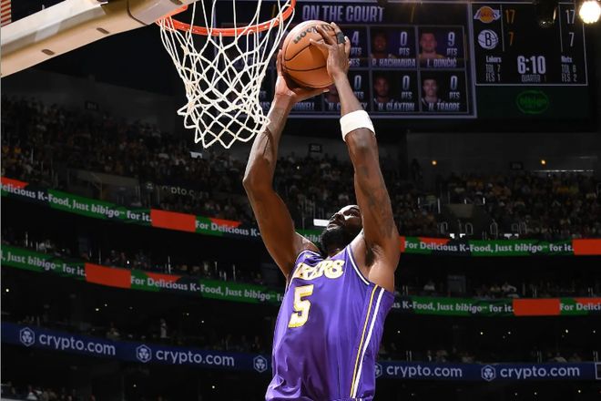 本场比赛中,湖人的先发中锋德安德烈-艾顿(DeAndre Ayton)的出场时间并不多,但是其实整体表现还是不错的。艾顿全场出场21分56秒,投篮3中3,罚球4中3,得到了9分7篮板1抢断3盖帽的数据,还有2次失误和2次犯规,正负值为+5。艾顿在进攻端还是没有办法得到更多的出手机会,但是他的进攻效率相当不错,还是在对手内线制造了一些威胁的。除此之外,艾顿在篮板保护方面的表现也是值得肯定的,而且他在内线防守和护筐方面的表现更是算得上可圈可点。看起来篮网先发中锋尼古拉斯-克拉克斯顿(Nicolas Claxton)在艾顿面前得到了一些分数,但是实际上这也和湖人在防守策略方面的选择相关。艾顿不得不被换防,而其他球员又没有足够出色的内线防守能力,这才是克拉克斯顿得到不少分数的关键因素。