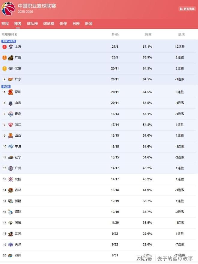 广厦目前取得了26胜5负的战绩排名第2,紧追上海,而后面竞争就激烈了,北京、广东、深圳、山东,战绩同为20胜11负,排名3-6位,4支球队战绩相同,展开了联赛第3的激烈争夺!