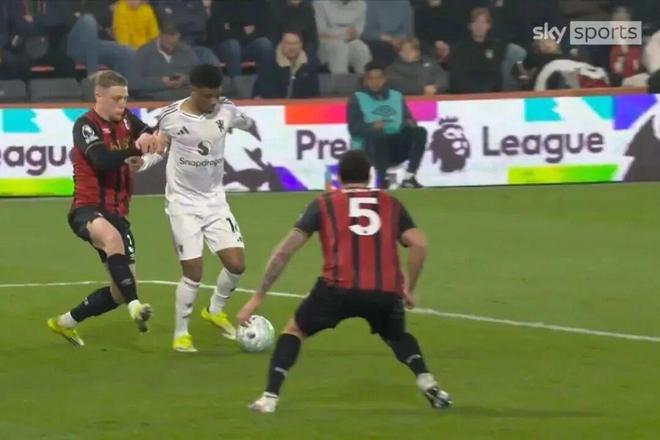 先看比赛第67分钟的一次关键场景。阿玛德-迪亚洛在禁区内接球,横向移动准备摆脱防守时,被伯恩茅斯中后卫从侧后方明显拉拽,对方手臂有清晰的发力动作,直接导致阿玛德失去平衡倒地。从慢镜头回放来看,这完全是一个具备判罚条件的身体接触。然而,主裁判对此毫无表示,示意比赛继续。